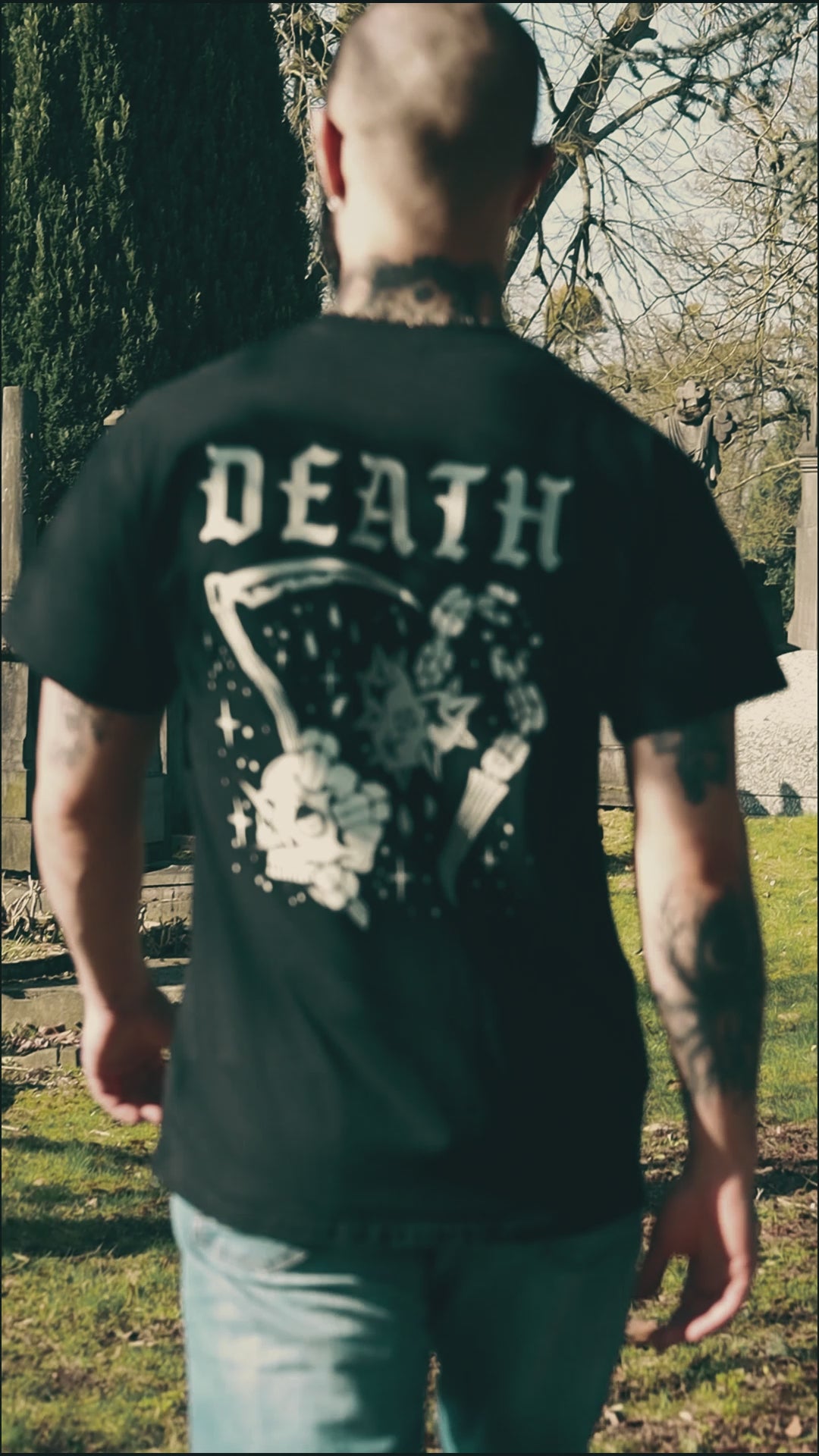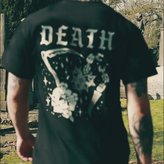 Ce t-shirt unisexe 100 % coton te plonge dans un visuel entre ciel et ténèbres : un crâne impassible, une faux affûtée, et un fléau dont la masse en forme de cœur épineux rappelle que même l’amour peut frapper fort. Symboles mystiques et aura macabre se croisent dans un design fort, entre passion fatale et destin tranché. Coupe droite, tissu résistant — pour celles et ceux qui osent afficher un style tranché, sans édulcorant. À porter tel quel ou en layering avec ta veste en cuir, ton hoodie favori ou une chemise oversize, selon ton humeur (ou ton niveau d'obscurité intérieure).